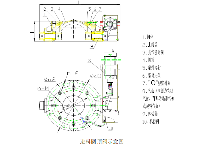 如進(jìn)料圓頂閥示意圖所示:氣動(dòng)圓頂閥大至由閥體、上閥蓋、充氣密封圈、圓頂、密封內(nèi)襯、密封支架、“O”型密封圈、氣缸、傳動(dòng)軸、氣缸、機(jī)械閥等組成。作為出料、排氣、切換等其它作用時(shí)配有進(jìn)料體和出料體;根據(jù)使用場合不同所配氣缸有直線氣缸、扇形氣缸、旋轉(zhuǎn)氣缸3種形式。
