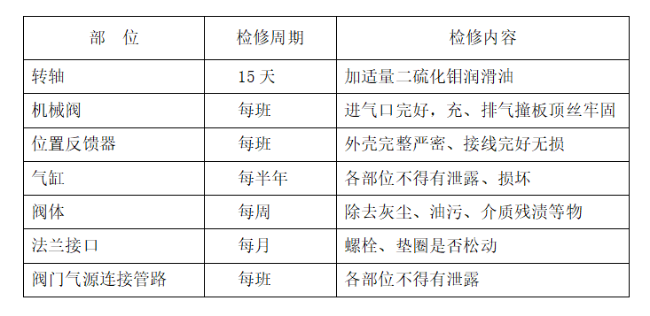 3)應(yīng)經(jīng)常檢查閥門的氣密性及運(yùn)行情況,氣缸的密封應(yīng)良好,各密封面、點(diǎn)應(yīng)完整牢固,嚴(yán)密無損。氣缸進(jìn)氣口接頭不允許有損傷,氣缸和氣源管路的各部位不得有泄露,保證氣源管路的連接完好無損,保持正常的氣源壓力。